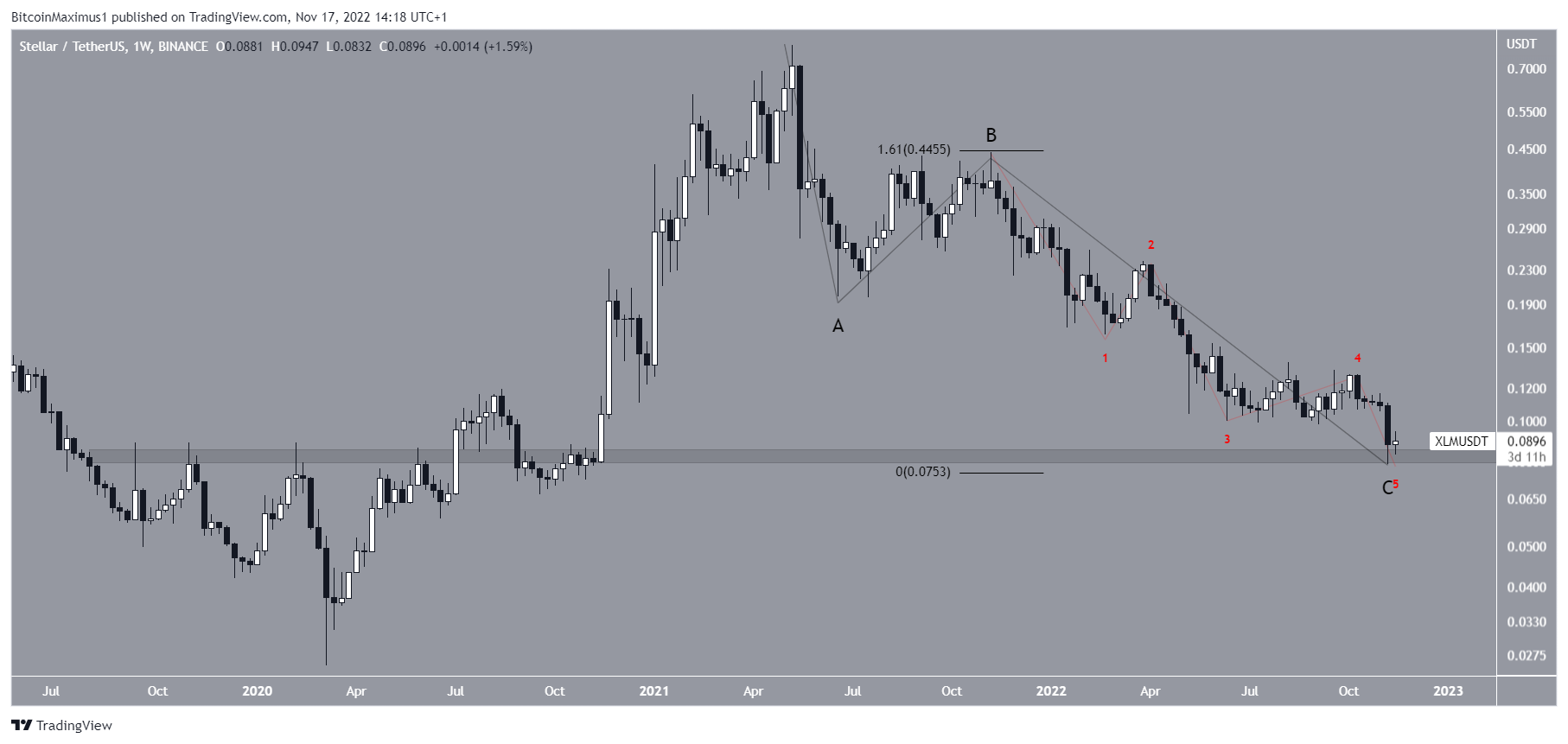 Since the all-time high, the XLM price might have completed an A-B-C corrective structure (black). The sub-wave count is given in red, suggesting that XLM has completed wave five.