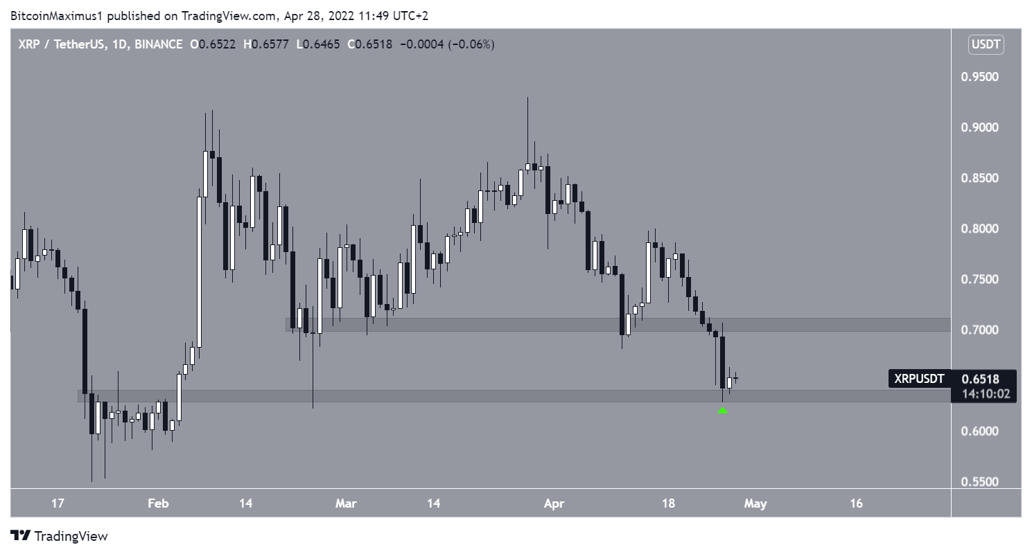 XRP has been falling since reaching a high of $0.93 on March 28. The downward movement led to a low of $0.62 on April 26. XRP bounced slightly afterwards (green icon), but has yet to initiate any type of upward movement.