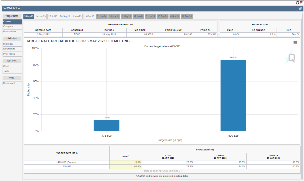The CME FedWatch Tool agrees, assigning an 87.4% probability of an upcoming 25 basis point hike.