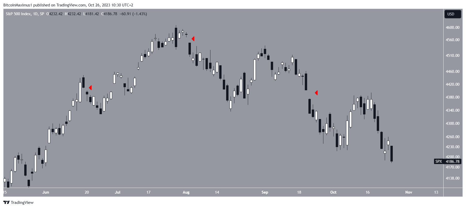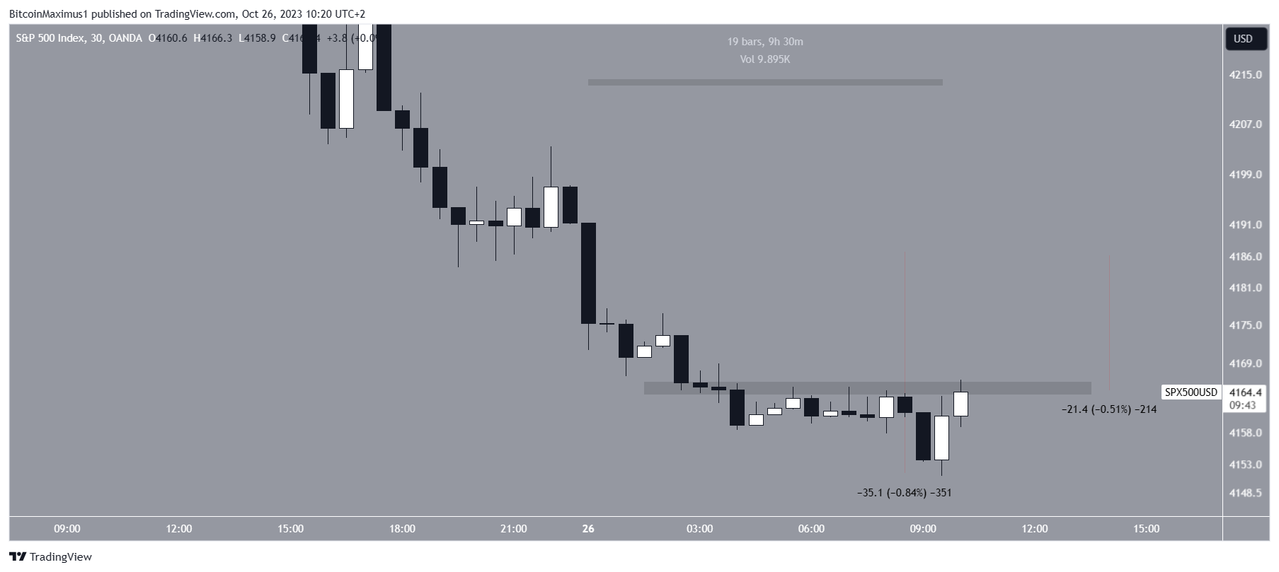 The SPX price began to fall immediately after the market closed last night. The price decreased by nearly 1%, falling to $4,151 early this morning.