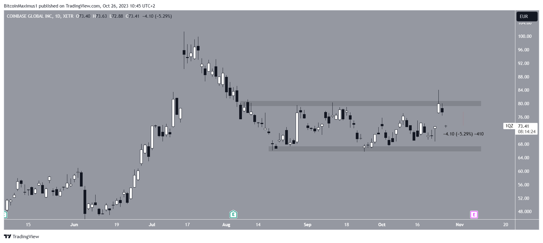 COIN has traded between $66 and $80 since the start of August, and the decrease put the price in the middle of this trading range.