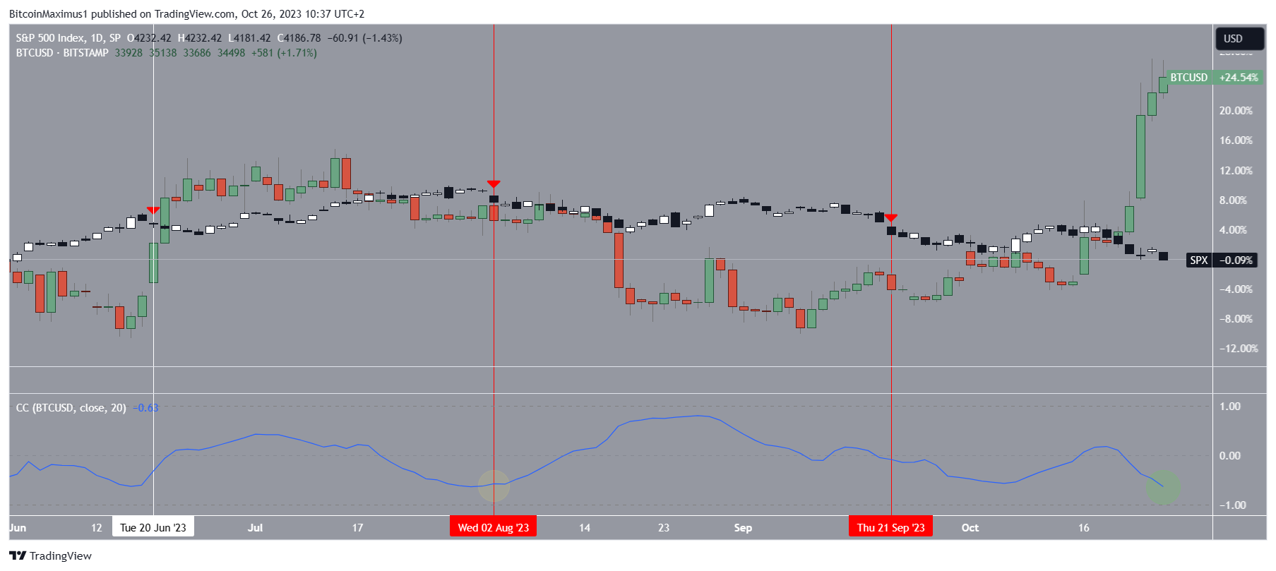 It is worth mentioning that the correlation (blue) between SPX and Bitcoin is currently at – 0.65 (green circle).