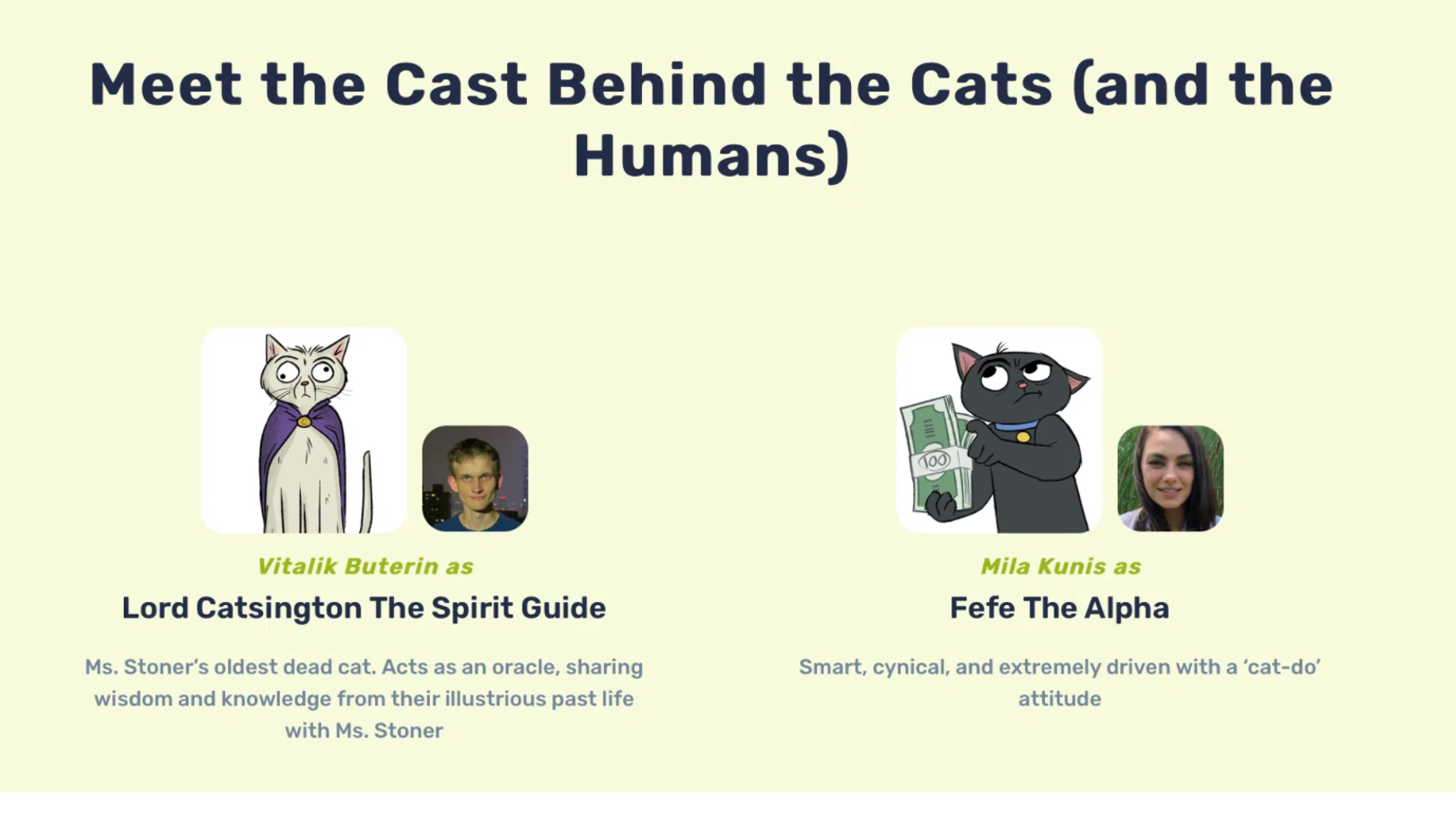 Stoner Cats is an animated series featuring Mila Kunis, Ashton Kutcher and Ethereum’s Vitalik Buterin. Mila Kunis not only acted in the series, she also produced the series as well.