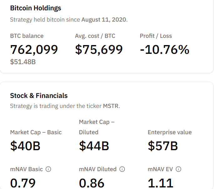 However, the basic mNAV tells a different story. Strategy’s basic mNAV is 0.79, meaning the common stock market cap of $40 billion is valued below the company’s BTC holdings.