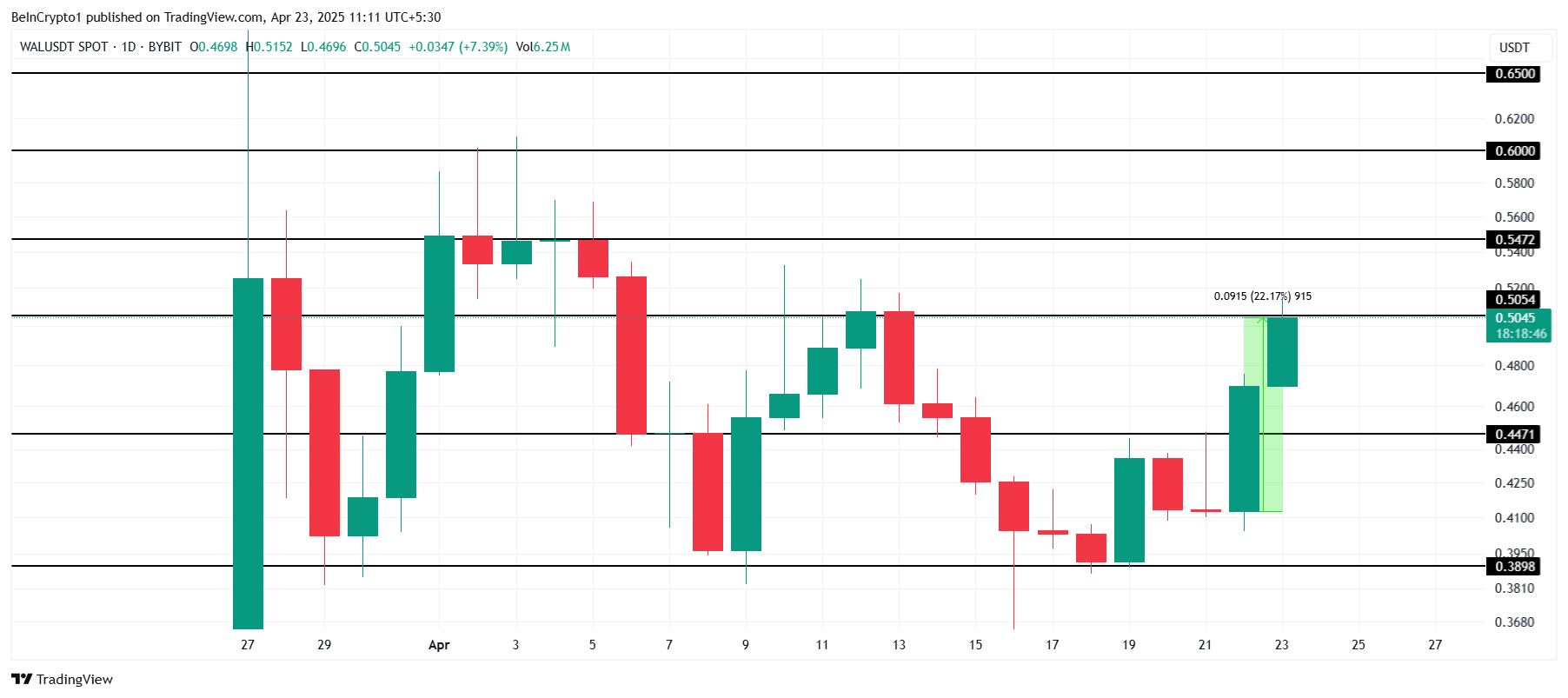 WAL has experienced a notable 22% increase over the last 24 hours, now trading at $0.504. This surge is a result of heightened market volatility throughout the month.