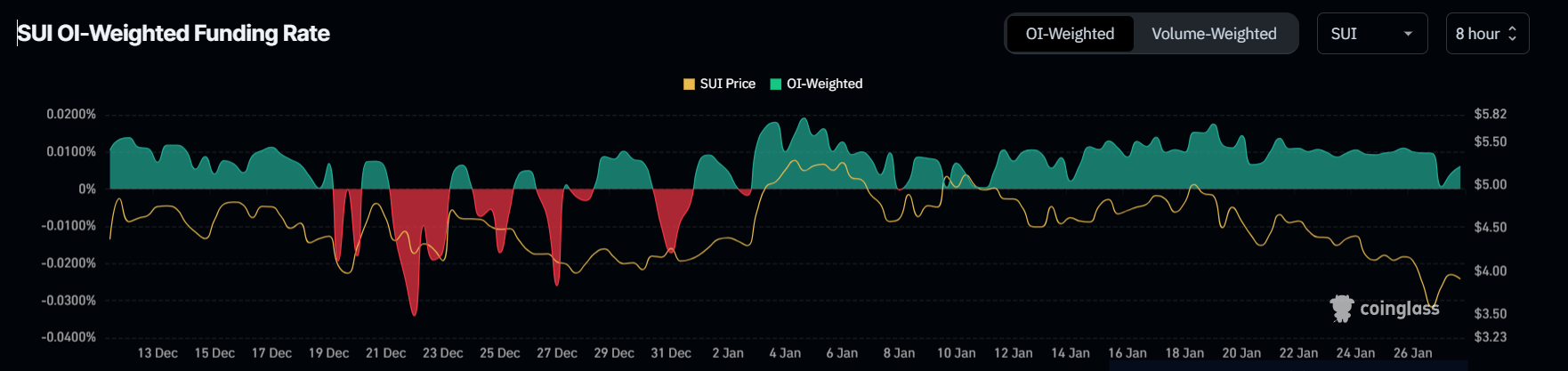 Despite the downturn, SUI’s funding rate remains positive, indicating lingering optimism among traders. This trend has persisted since the start of the year, following the formation of SUI’s all-time high. Notably, this contrasts with December 2024, when traders placed short contracts even during minor declines.