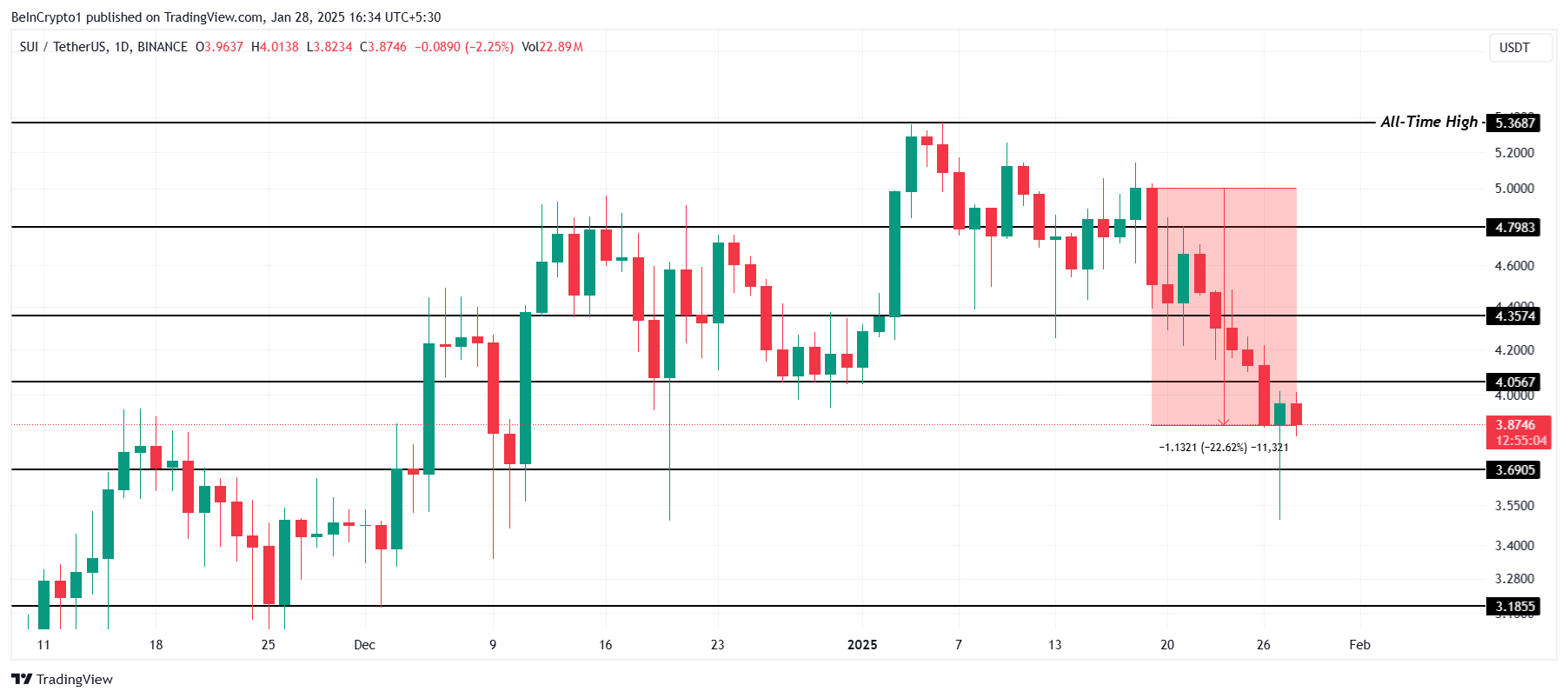 SUI’s price has dropped by 22% over the last nine days, currently trading at $3.87. The crypto recently lost the $4.05 support level but remains above the critical support at $3.69. Holding this level is essential to prevent further downside in the near term.