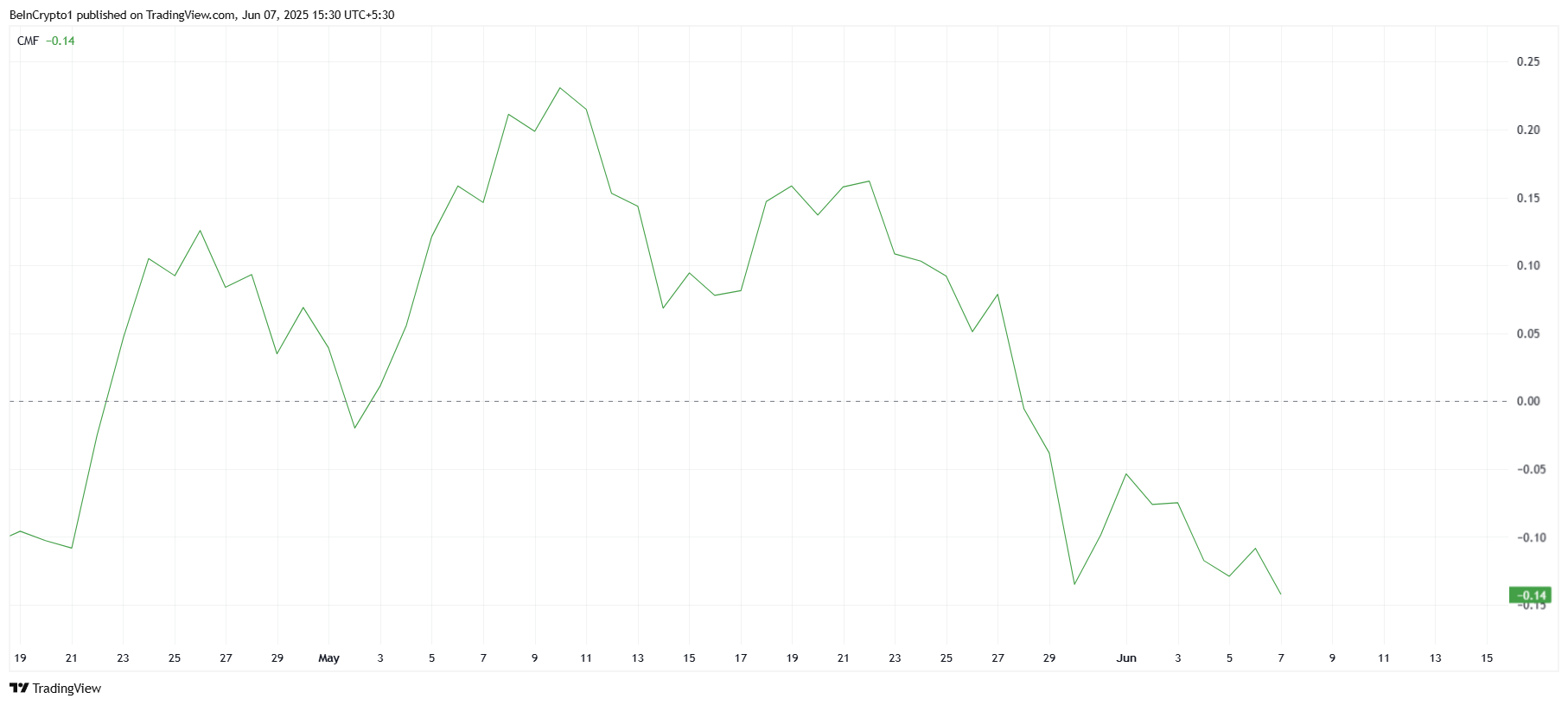 Despite the recent 12% rise, the Chaikin Money Flow (CMF) indicates a decline, signaling a lack of investment inflows. The CMF is currently showing negative momentum, suggesting that investors are not fully backing SUI’s price rise.