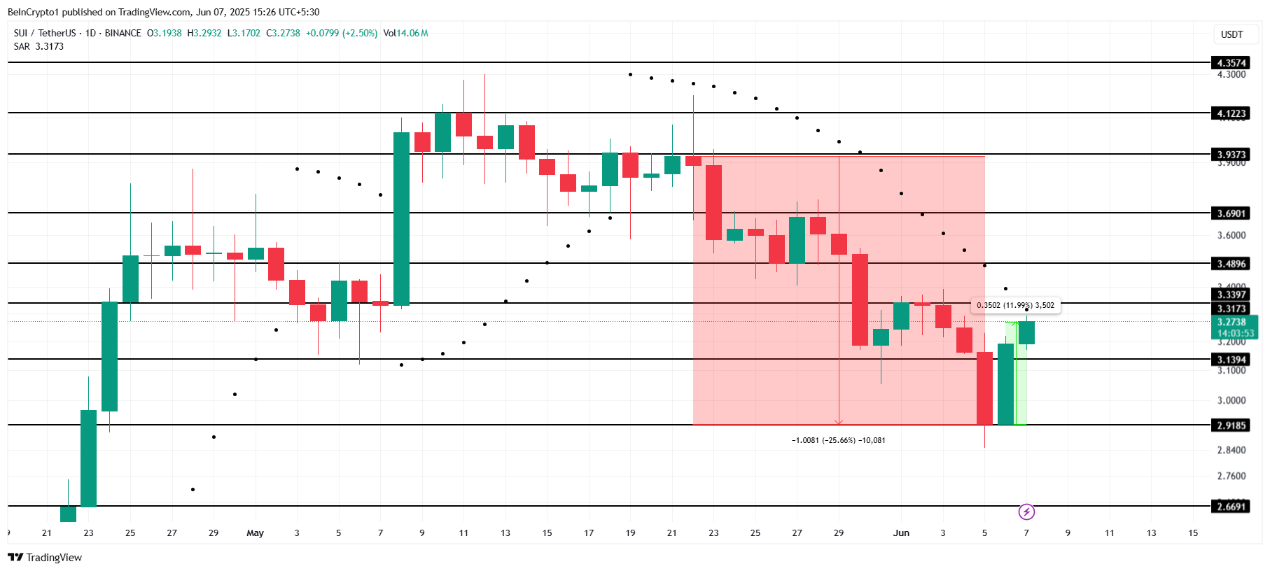 At the time of writing, SUI is trading at $3.27, having risen by 12% in the last 24 hours. The price is currently facing resistance at $3.33, which has proven to be a significant barrier in the past.