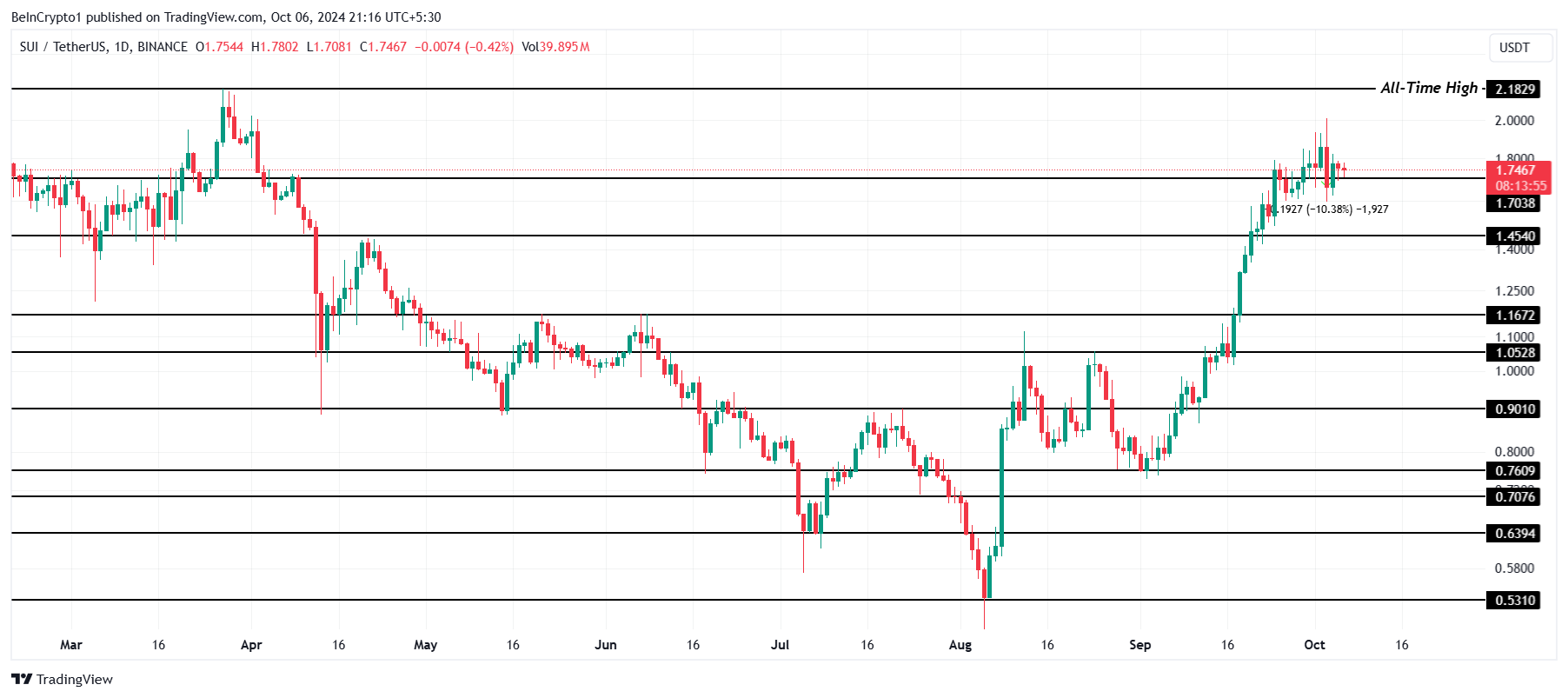 SUI’s price is currently hovering at $1.74, just above the critical support level of $1.70. If the support is lost, the altcoin could fall further, leading to a larger price drop.