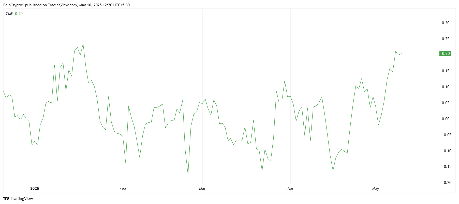 Technical indicators also support SUI’s overall macro momentum. The Chaikin Money Flow (CMF) is currently at a near four-month high, signaling that inflows are outweighing outflows.