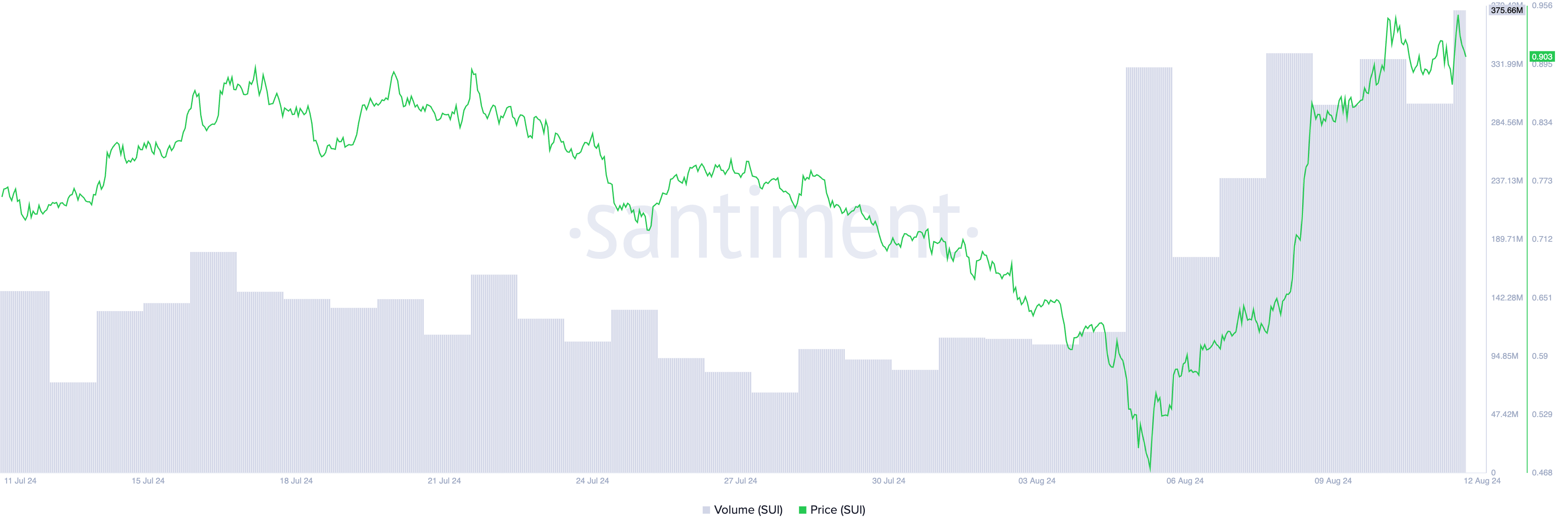 SUI has seen a surge in its trading activity over the past few days. In the last 24 hours alone, the coin’s daily trading volume has totaled $376 million, its highest since June 7, according to Santiment.