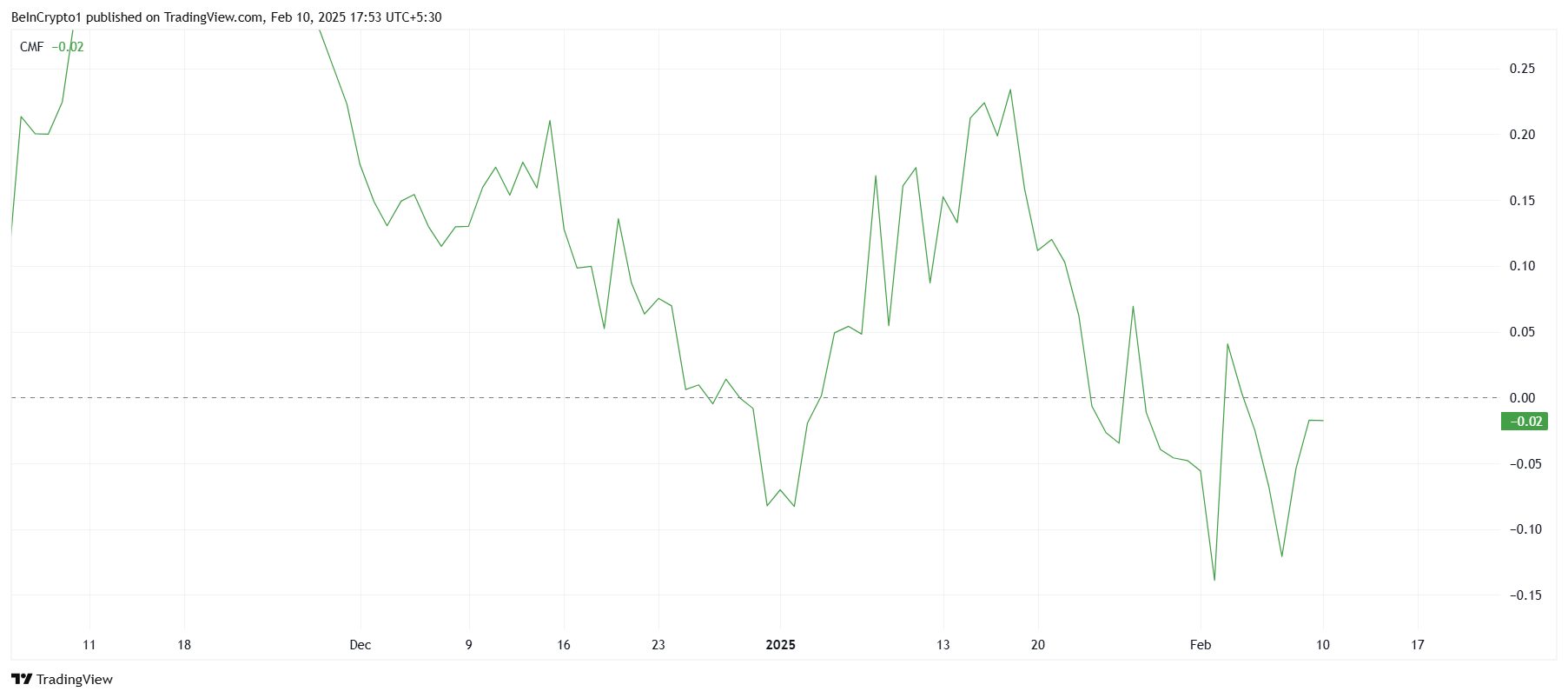 The Chaikin Money Flow (CMF) indicator highlights ongoing capital outflows, reflecting weak investor participation. Since the start of the month, CMF has failed to close above the zero line, showing that selling pressure continues to dominate. This suggests that investors remain skeptical about SUI’s potential for a sustained price increase.