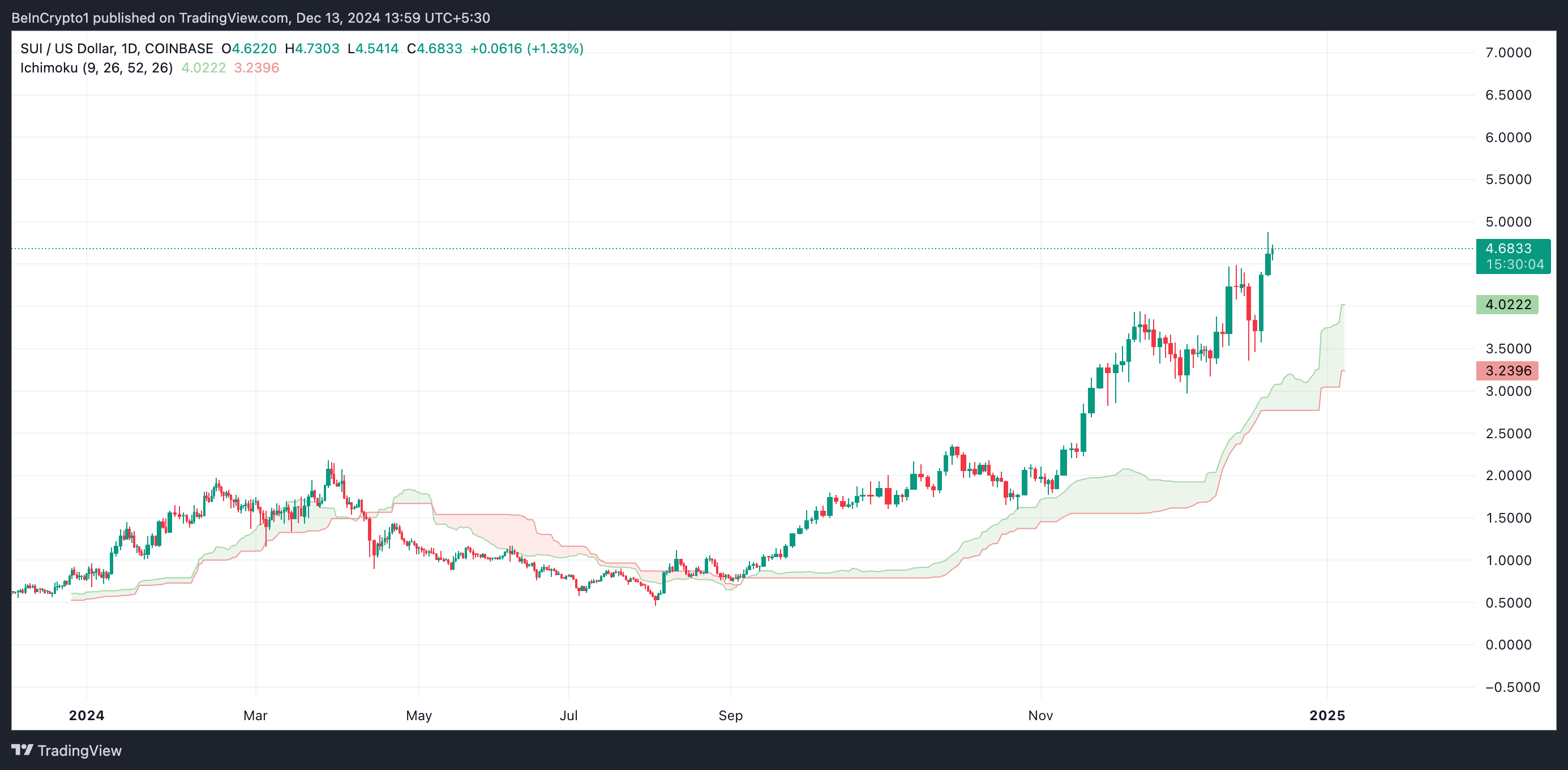 As assessed on a one-day chart, SUI’s price movement shows that it trades above its Ichimoku Cloud. This indicator tracks the momentum of an asset’s market trends and identifies potential support/resistance levels.