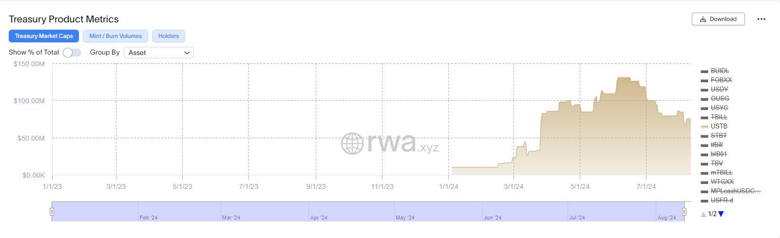 Data from RWA.xyz shows that as of August 11, Superstate’s USTB has a market capitalization of $75.31 million. This figure makes it the seventh-largest tokenized treasury fund in the market. Notably, USTB reached this number in just approximately six months after its debut in February.
