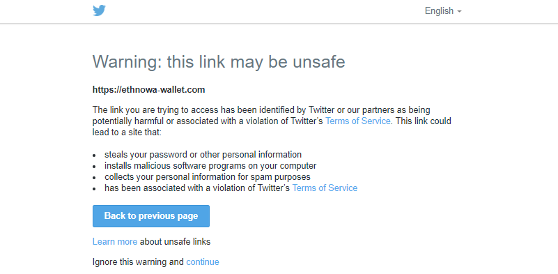- Warnings by Twitter that the site for the wallet is “potentially harmful”