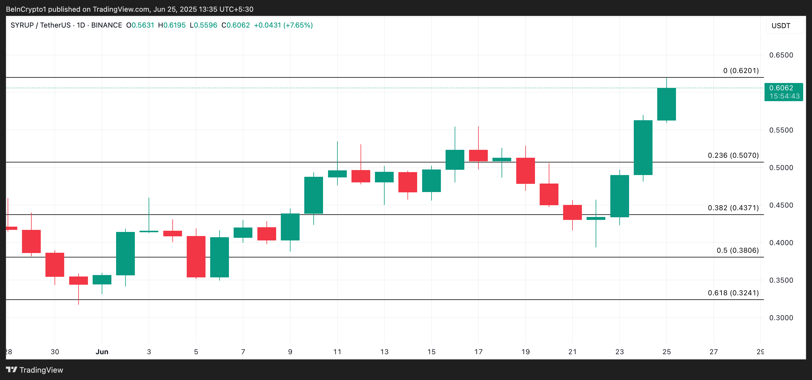 When the Aroon Up line is at 100%, the asset has reached a recent high within the lookback period, typically 25 periods. This is the case with SYRUP, which has registered a new all-time high of $0.6195 during today’s trading session.