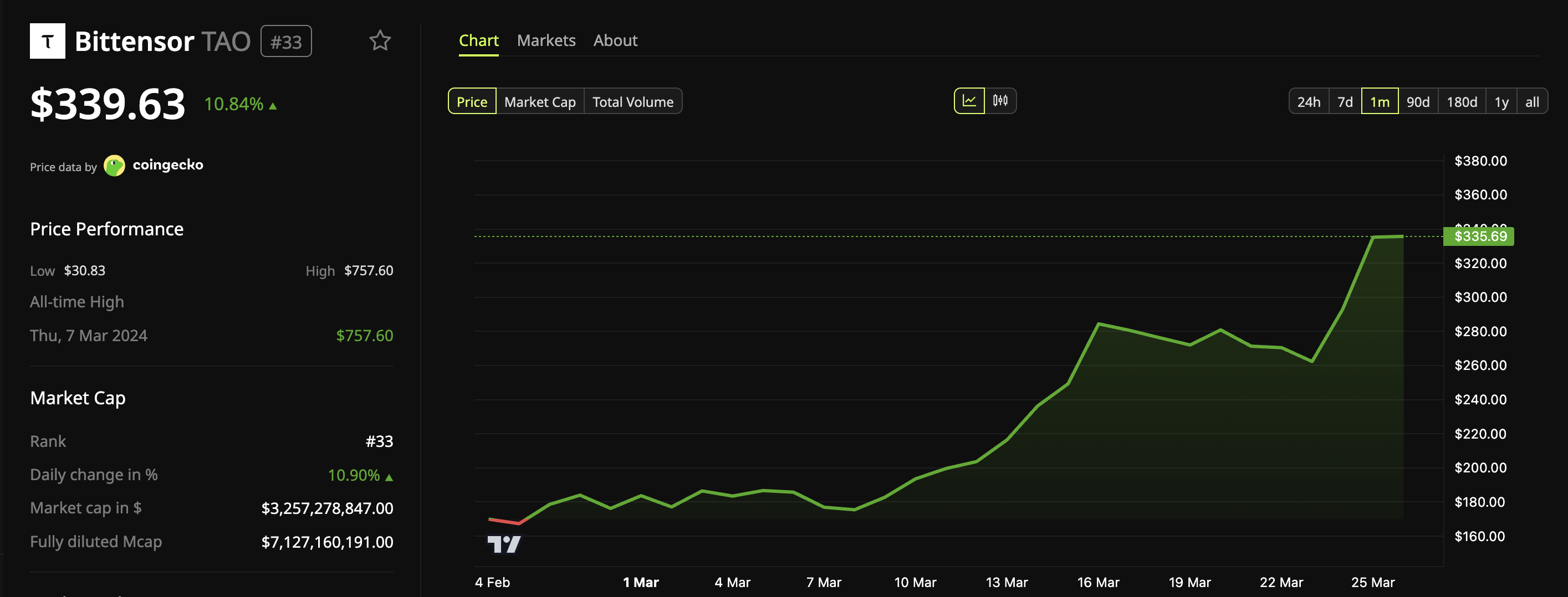 In addition, TAO rose neraly 11% over the last 24 hours, making it one of the top-performing cryptocurrencies among the top 100 by market capitalization. At the time of writing, the altcoin was trading at around $339, its highest level since November 2025.