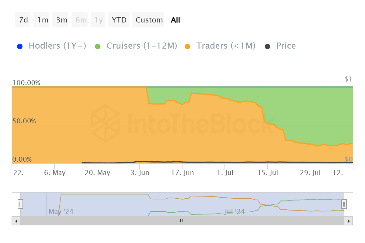 Notcoin’s price could benefit from the increasing conviction among NOT holders. Over the last two weeks, the network has seen a shift in sentiment. The mid-term holders’ concentration currently stands at 75%, a significant increase from 25% last month.
