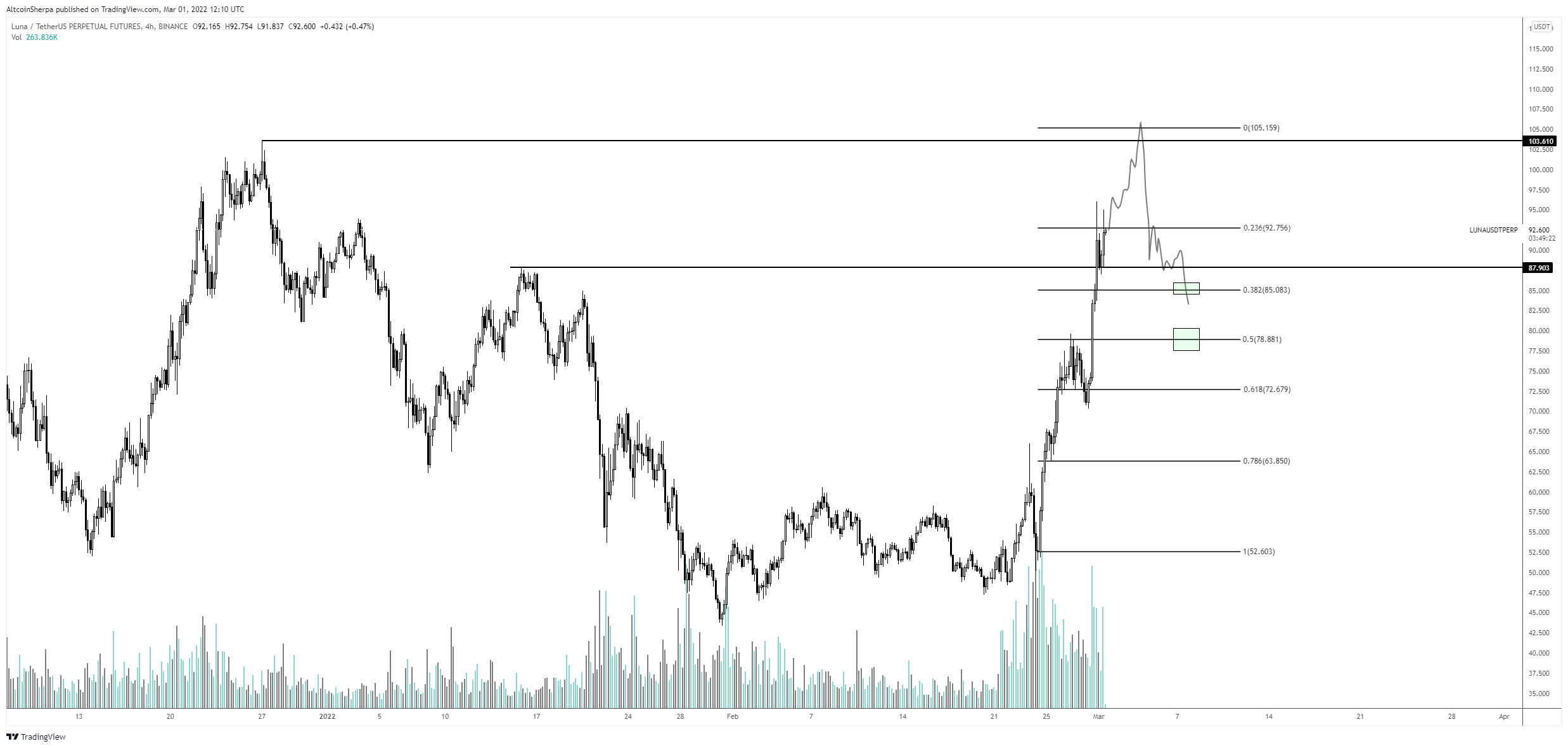 Cryptocurrency trader @AltcoinSherpa tweeted a chart of LUNA, stating that it is possible that the price will reach a new all-time high before falling.