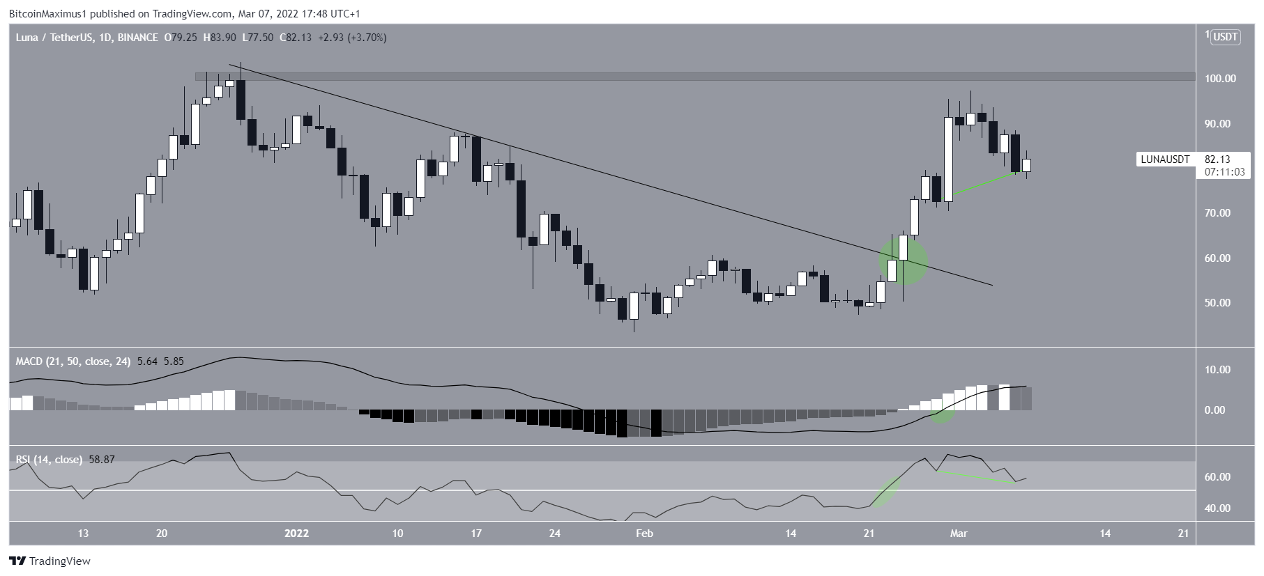 The price has been moving upwards since, and broke out from the descending resistance line on Feb 24 (green circle). The upward movement has been swift, and LUNA did not even return to validate the line as support.Â