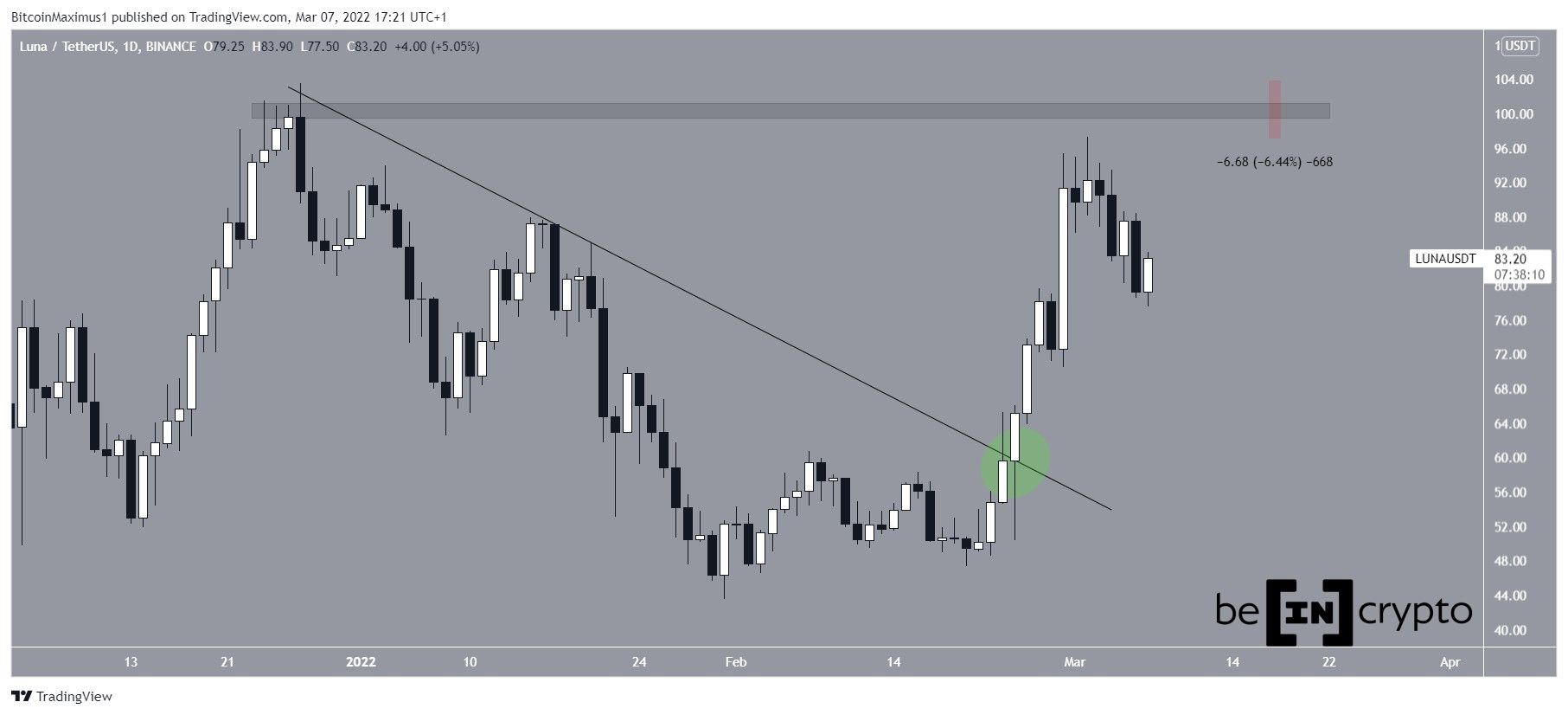 Terra (LUNA) has been falling since it barely failed to reach a new all-time high price on March 2. However, it is possible that it will make another attempt in the near future.
