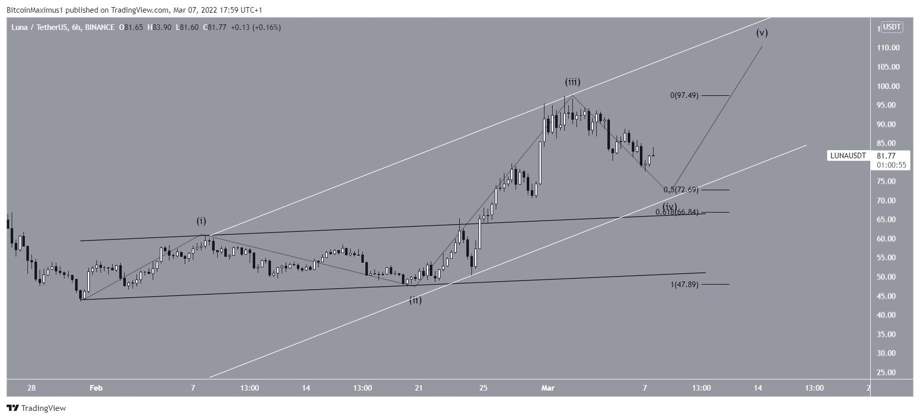 While LUNA has been increasing since Jan 31, its rate of increase accelerated on Feb 24, once it broke out from an ascending parallel channel. The shape of the increase suggests that it was wave three of a five wave upward movement.Â