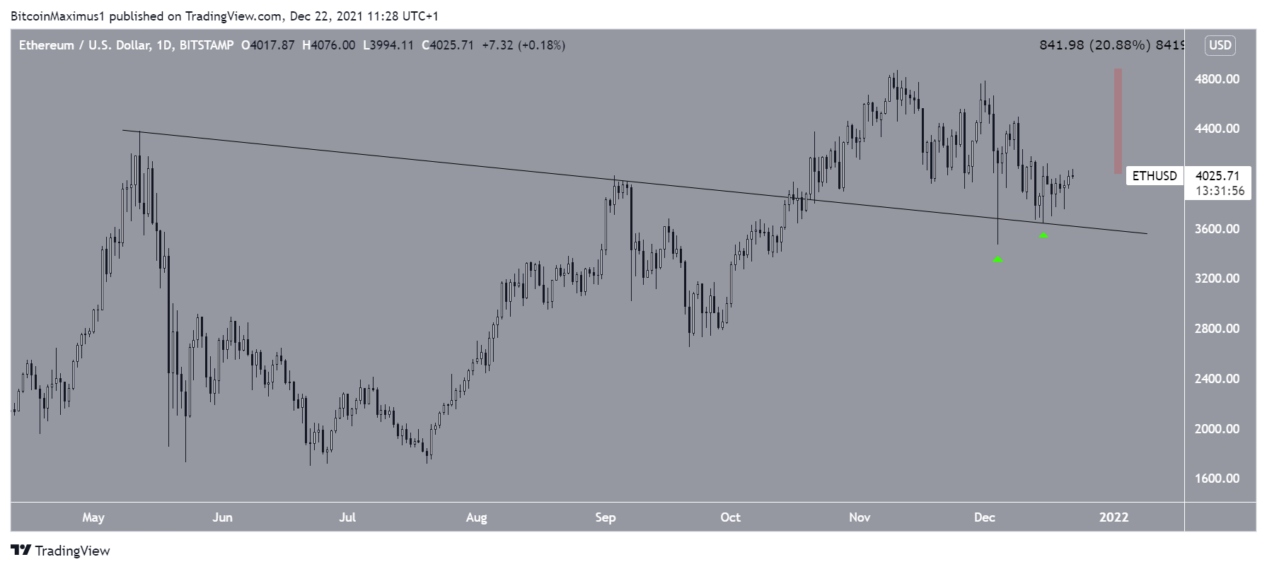 ETH has been moving upwards since its last test of support and is currently 21% below its all-time high price.