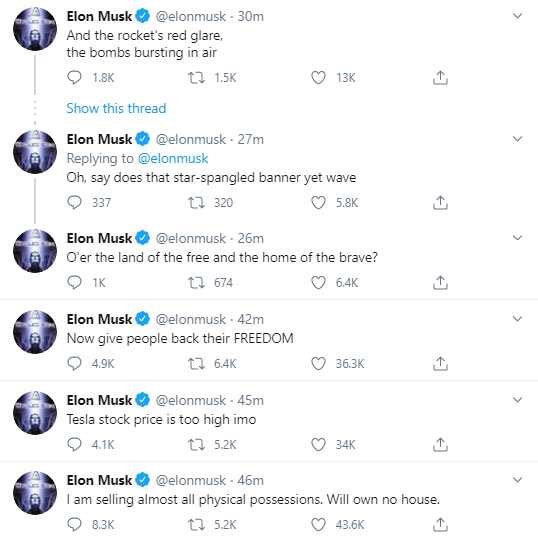 In his most recent all-holds barred rant, Musk went off on Tesla’s lofty valuation, America’s freedom and — in an Armageddon-type style — his own personal assets. If it’s true, he’s selling “almost all physical possessions” including real estate. Below is a snippet of of the series of tweets, all of which seemed to be published within minutes of each other.