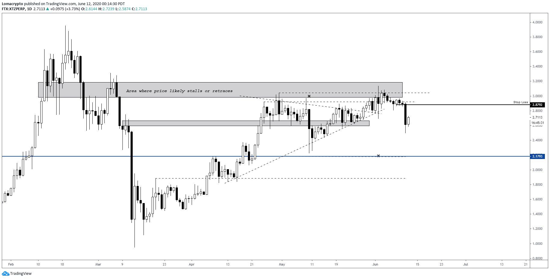 The breakdown occurred with significant volume and took place after the price failed to move above the main resistance area at $3, even though it had previously moved slightly above it in the form of a long upper wick.