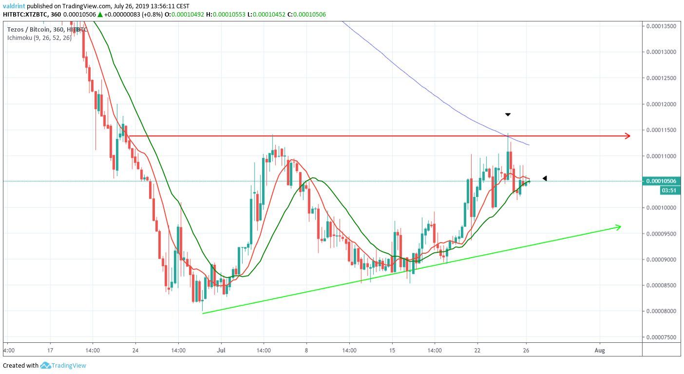 On June 29, 2019, the Tezos (XTZ) price reached a low of 8000 satoshis. An upward move ensued. On July 15, XTZ reached a high of 11,200 satoshis. After a downtrend that lasted for about ten days, the price began an upward move and reached similar highs on July 24.