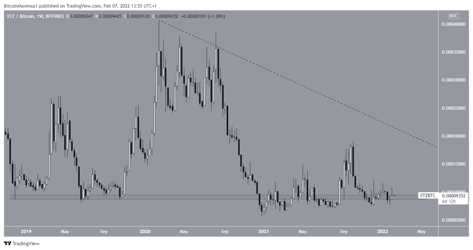 After initially falling below the 9000 satoshi area, XTZ has reclaimed it and is in the process of validating it as support. If it is successful in doing so, it would be a strong sign that a bullish reversal is transpiring.