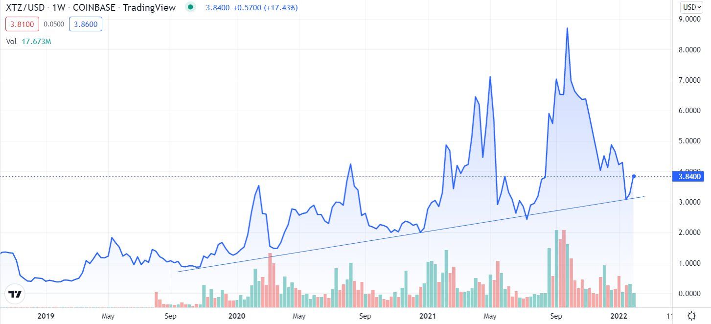 SponsoredA look at the weekly chart for XTZ reiterates the importance of the $3.90 horizontal area, since it has intermittently acted as both support and resistance since March 2021.Â