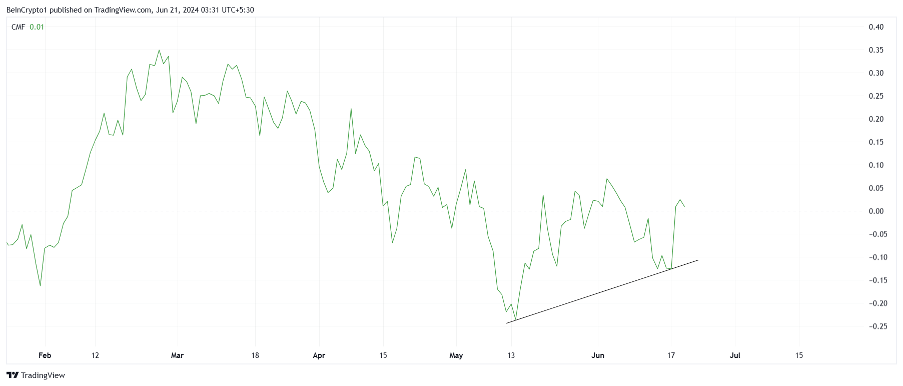 XTZ price has a shot at climbing back the charts since the investors are slowly increasing the capital invested in the asset. The Chaikin Money Flow (CMF) indicator shows a significant surge in Tezos’ inflows. This is a positive sign, indicating an increase in buying pressure for the cryptocurrency.