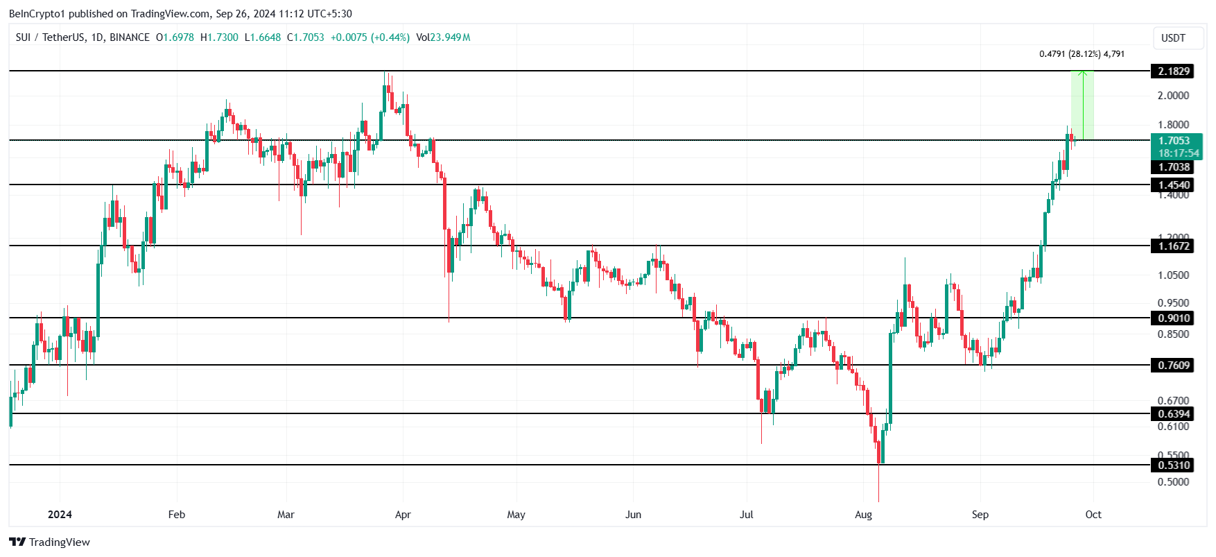 SUI enjoyed an exceptional September, rising by over 113% since the beginning of the month. Currently changing hands at $1.70, the altcoin is looking to secure it as a support floor since the all-time high of $2.18 lies 28% above the current price.