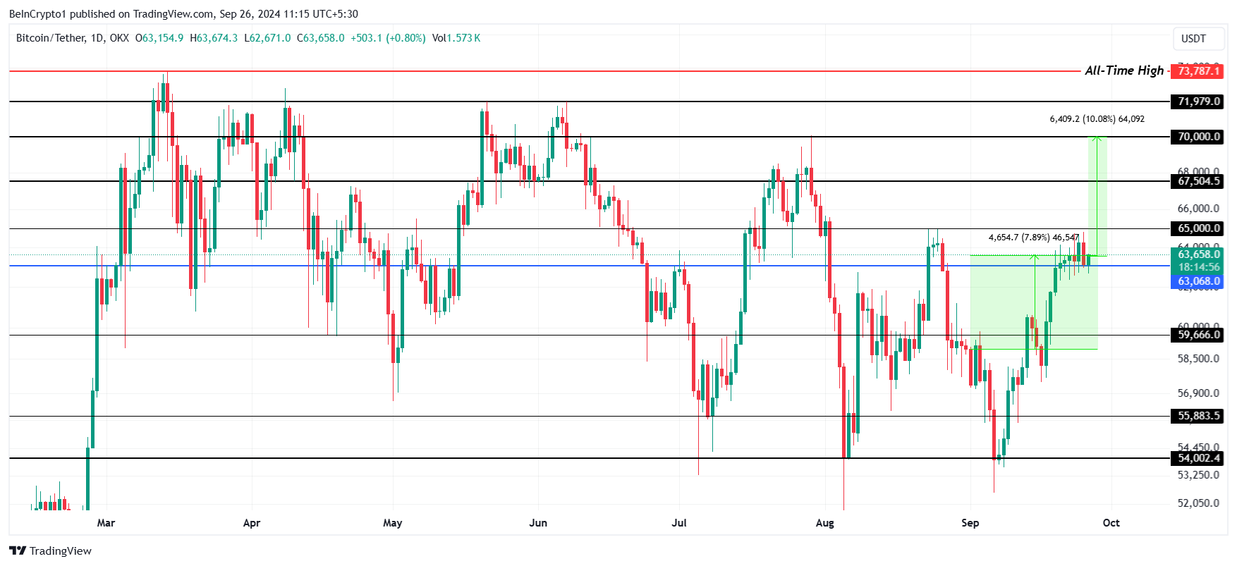 Bitcoin’s price rose by 7.8% throughout the month of September, even when the crypto market was noting no bullishness. This increase brought BTC to change hands at $63,658 at the time of writing.
