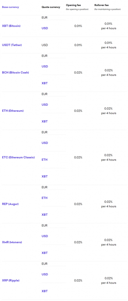 All contracts are charged a rollover fee of 0.02 percent — except Bitcoin (XBT) and Tether (USDT), which each carry a 0.01 percent rollover fee.