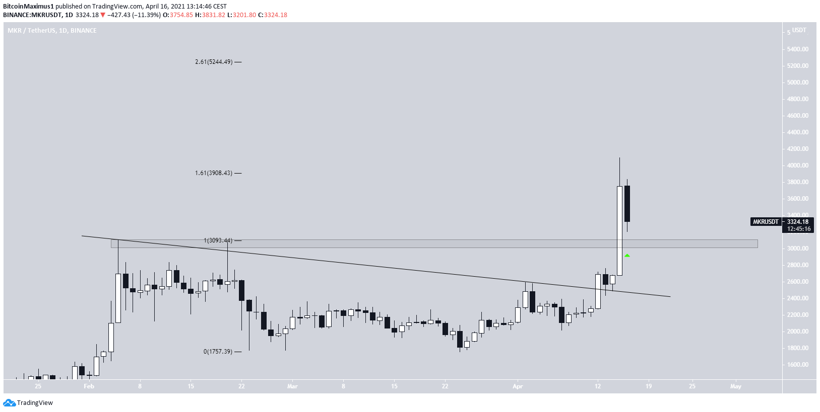 MKR broke out from a descending resistance line on April 13. Two days later, it proceeded to reach an all-time high price of $4096.