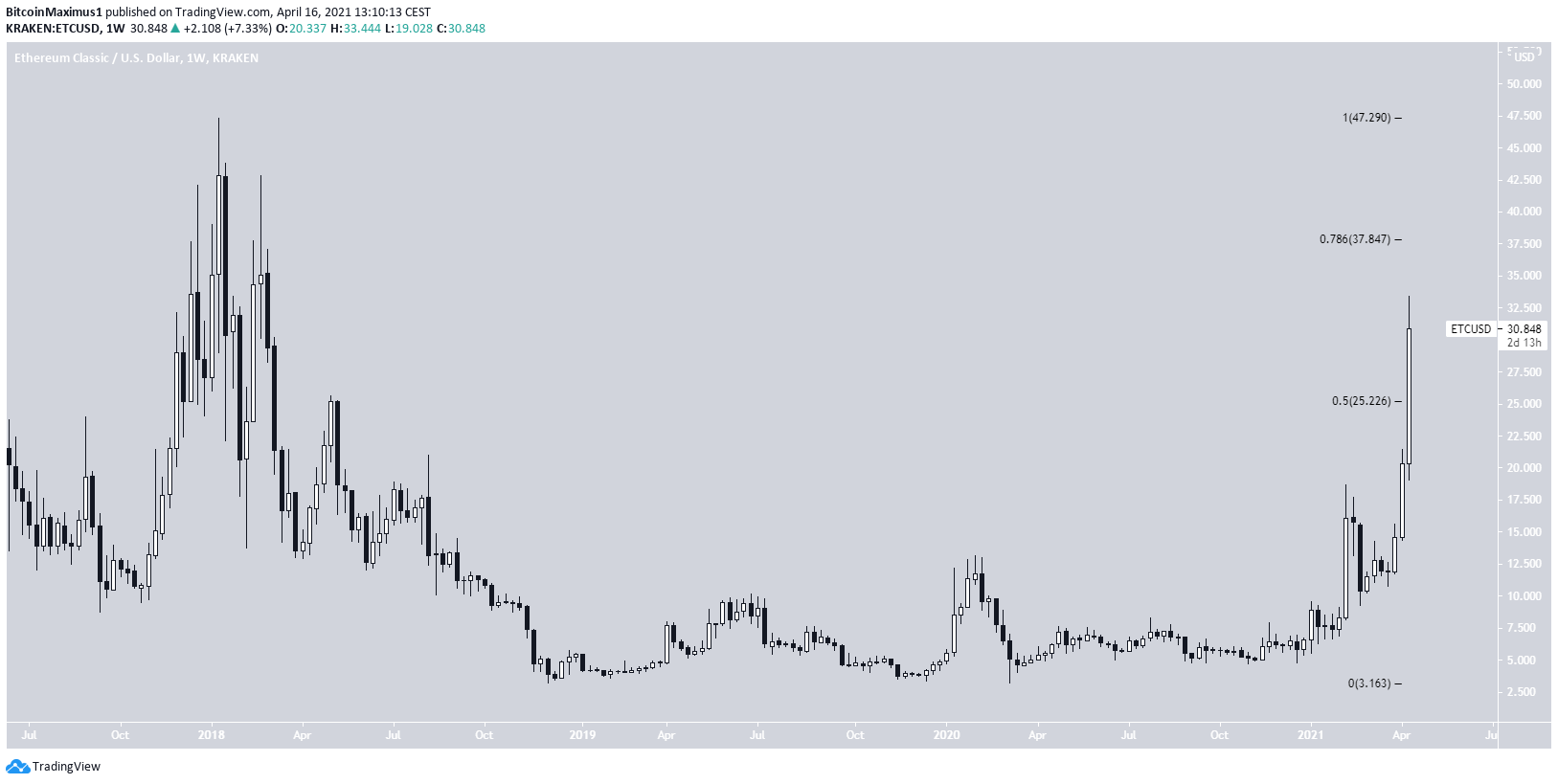 ETC has increased considerably over the past two weeks. Currently, it has moved above the 0.5 Fib retracement level at $25.26. Previously it had traded below this level since April 2018.