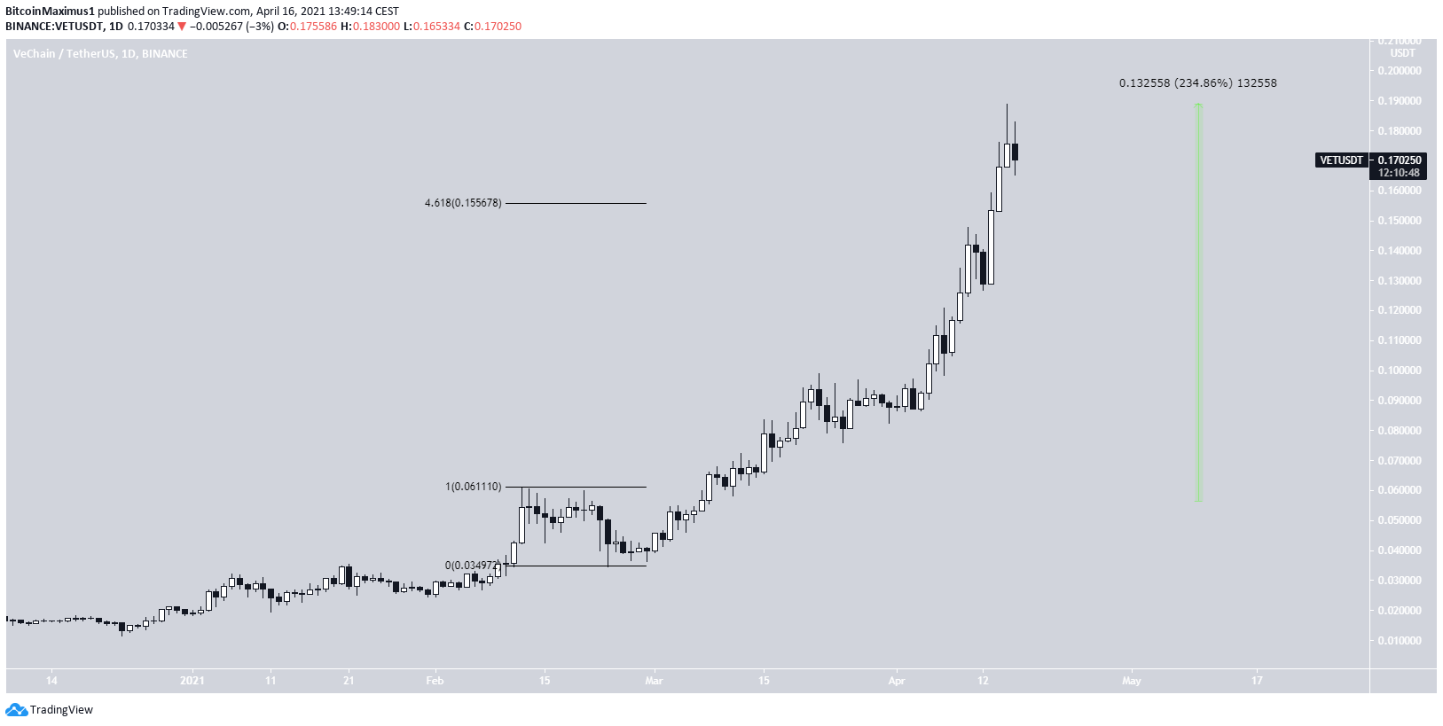 However, the rate of increase is parabolic, and VET has already moved above the 4.61 external Fib retracement, a level that often acts as the top.