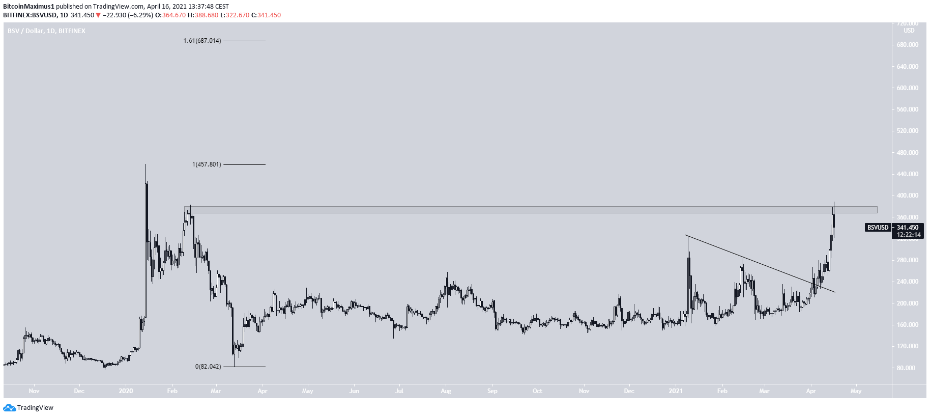 BSV has been increasing since breaking out from a descending resistance line on April 6. Currently, it has reached the $370 resistance area but was rejected.