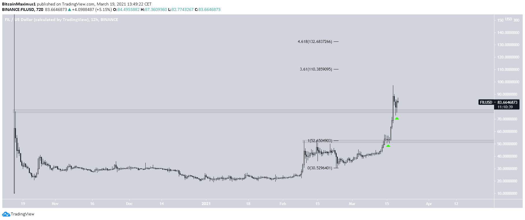 FIL has been increasing since breaking out from the $52.5 resistance area on March 15. After two days, it reached a high of $97.30. It has decreased slightly since then but validated the $77 area as support.