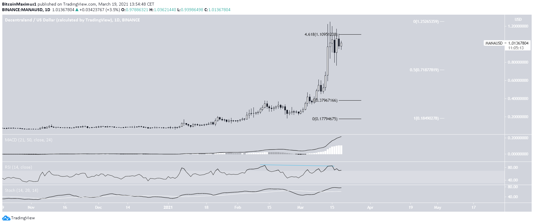 MANA has increased considerably since March 11. On March 14, it reached a new all-time high price of $0.1249. This was just above the 4.61 external Fib retracement at $1.10.