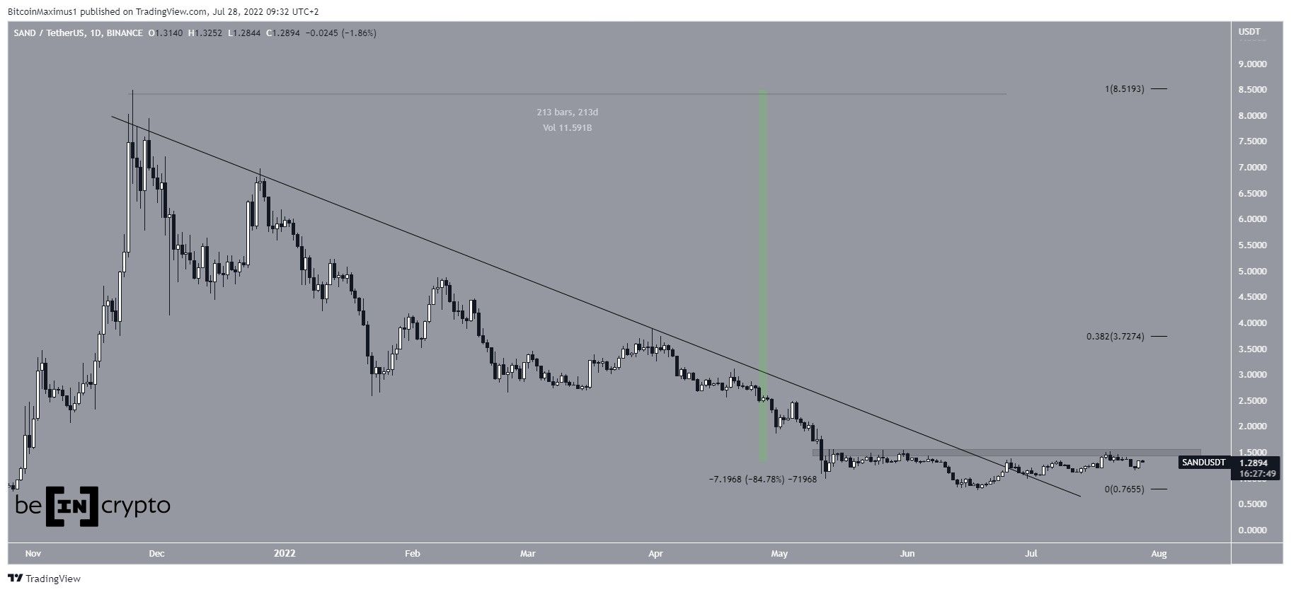 SAND had been falling underneath a descending resistance line since reaching an all-time high price of $8.50 in Nov. The downward movement led to a low of $0.74 on June 18, 2022.Â