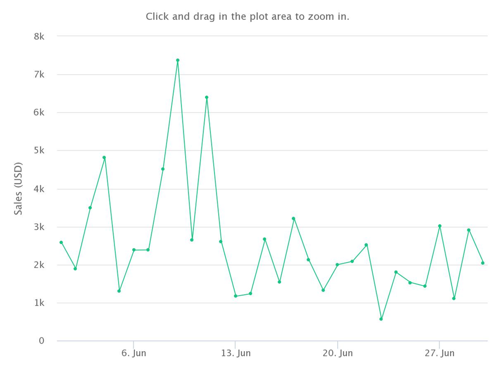 While the project saw a dramatic increase in sales since it’s 2021 yearly low of $2.53 in sales volume recorded for April 2021, sales volume in June had declined to $77.84 million from its January 2022 highÂ