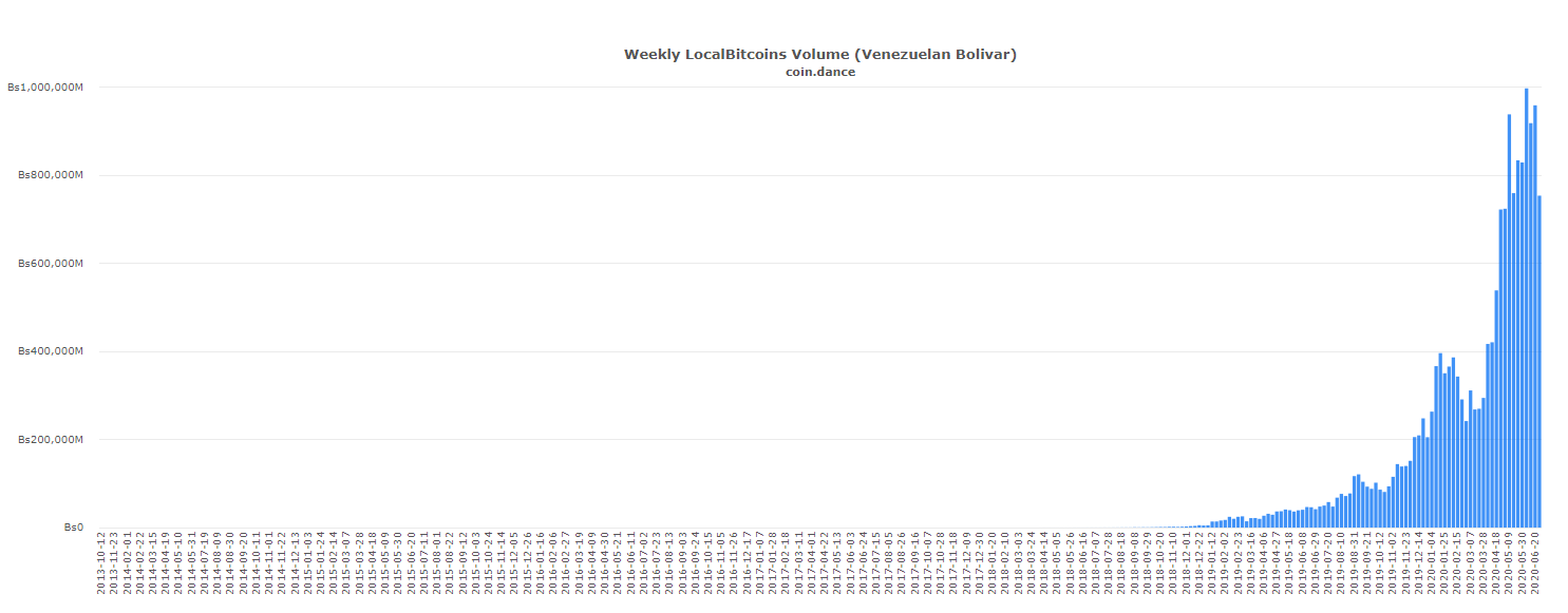 Since the beginning of 2020, LocalBitcoins has reported a huge surge in Venezuelan trading volume. 350 billion bolivars (VEF) traded hands in January. That figure stood at a whopping 1 trillion VEF in May. Bitcoin reportedly trades at a premium of at least $700 compared with international spot prices.