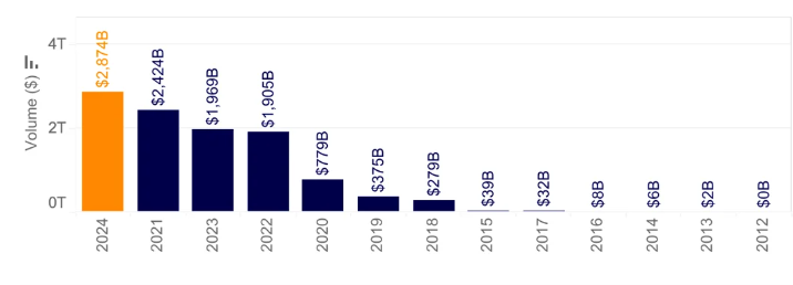 The Bitcoin trade volumes chart also highlights the current market volatility, showing increased trader participation. Cumulative trade volume is nearing a record $3 trillion, up nearly 20% in the first eight months of 2024 after its last peak in 2021.