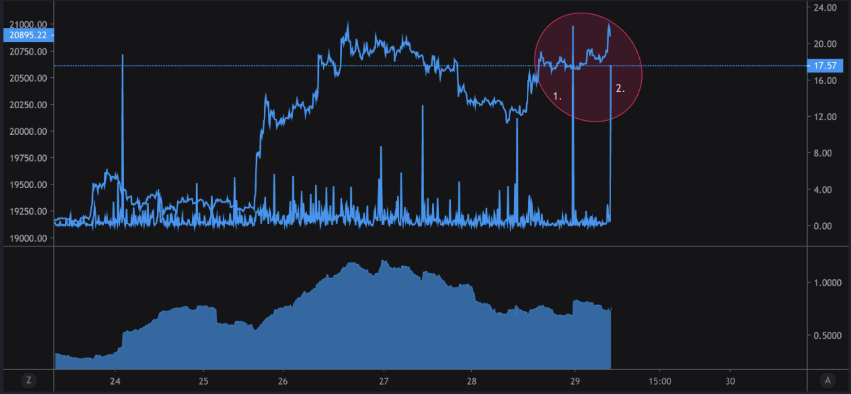 - A lot of liquidity on crypto exchanges around the $21,400 range. If Bitcoin price shoots up to that level, it can cause a cascade of liquidations.