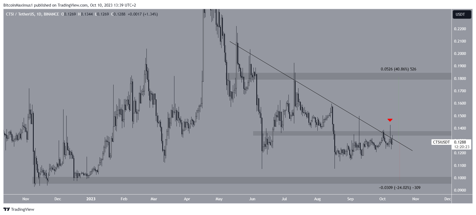 In order for CTSI to begin an upward movement., it has to break out from the descending resistance trendline and the $0.135 area. If that occurs, the price can reach the $0.180 resistance area, which is 40% above the current price.