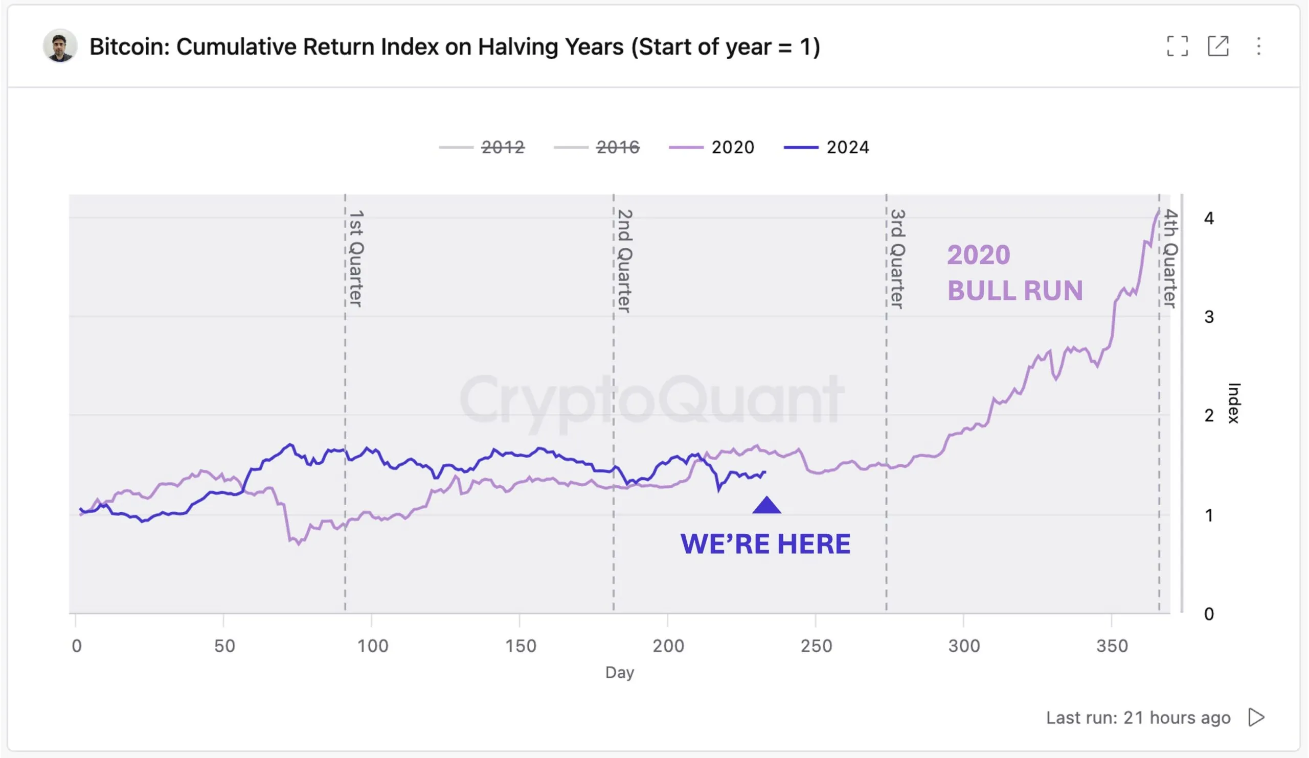 As seen above, the post-halving rally began in the fourth quarter (Q4) of each halving year. Thus, if we go by that recurrence, then a substantial upswing could start around October. Interestingly, CryptoQuant’s CEO, Ki Young Ju, also seems to agree with the sentiment.